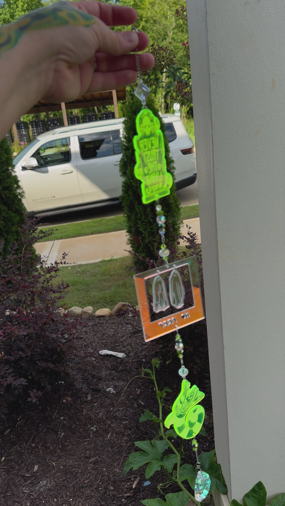A fun and fluorescent sun catcher inspired by Beetlejuice. The ghosties in the Polaroid move freely!